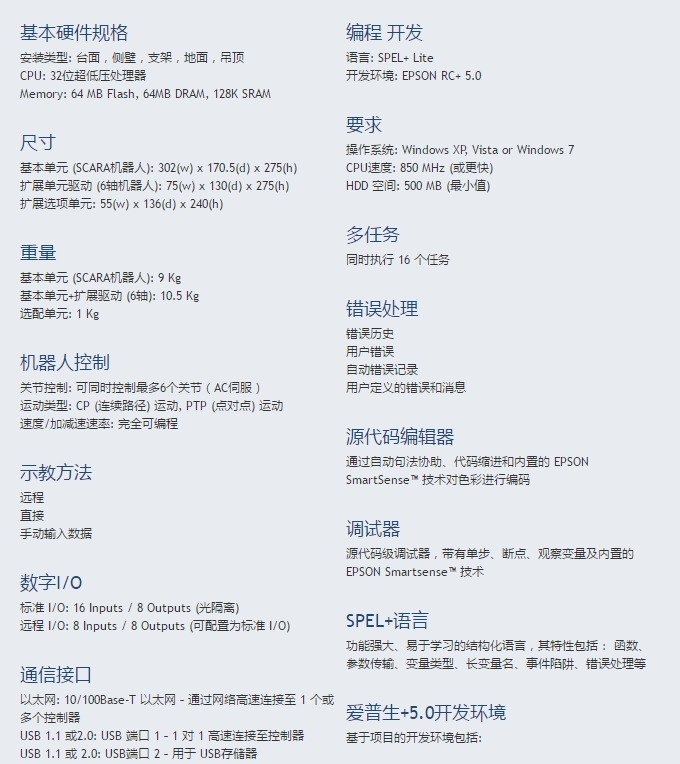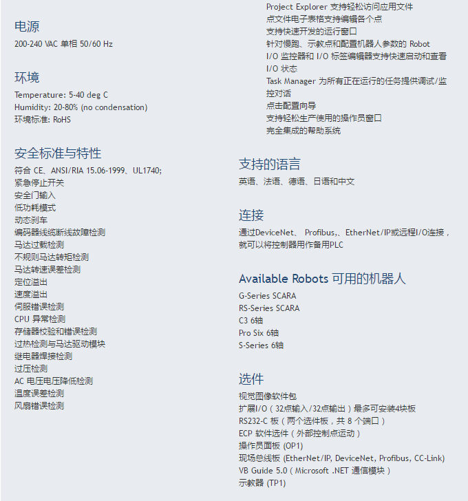 控制愛(ài)普生G系列和RS系列及S系列6軸機(jī)器人;完全集成選項(xiàng)包括:圖像處理、網(wǎng)絡(luò)連接性、以太網(wǎng)/IP和更多選項(xiàng)